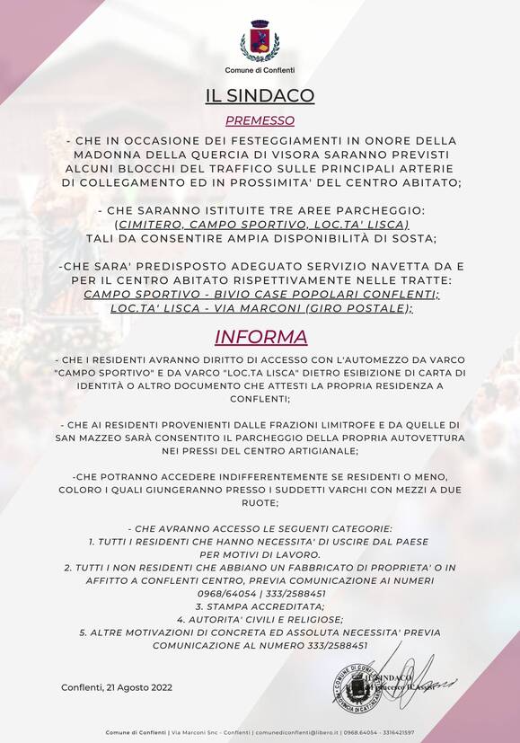 - CHE AI RESIDENTI PROVENIENTI DALLE FRAZIONI LIMITROFE E DA QUELLE DI SAN MAZZO SARÀ CONSENTITO IL PARCHEGGIO DELLA PROPRIA AUTOVETTURA