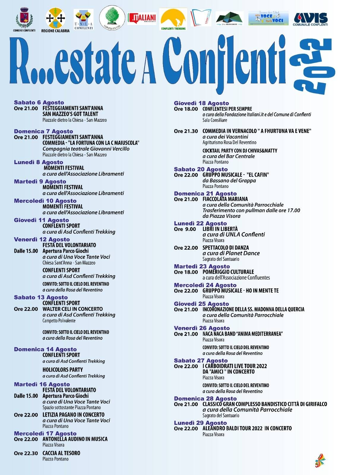 Un contenitore di diversi sport (beachvolley, calcio balilla, freccette, arrampicata) nato con l’idea di promuove le diverse discipline sportive, facendo conoscere al contempo il territorio conflentese. Il 17 agosto il paese si anima con la tradizionale caccia al tesoro, evento da sempre molto partecipato anche dai ragazzi dei comuni limitrofi. Il 18 Luglio, nella sala consiliare, la fondazione Italiani.it e l’amministrazione comunale, nell’ambito del progetto “ Conflentesi per sempre”, nato con l’obiettivo di rafforzare il legame tra Conflenti e le comunità di conflentesi nel Mondo, accoglieranno in modo ufficiale un discendente conflentese di terza generazione come suggello del legame tra Conflenti e i suoi emigrati". La kermesse dell'estate 2022 - spiegano - mira anche a valorizzare gli artisti e gli appassionati locali: Letizia Pagano in concerto (16 agosto), Antonella Audino in musica (17 agosto), spettacolo di danza a cura di Planet Dance (24 agosto) e il concerto del gruppo “Ho in mente te” con un repertorio che spazia dalle canzoni intramontabili italiane a composizioni inedite (24 Agosto)".